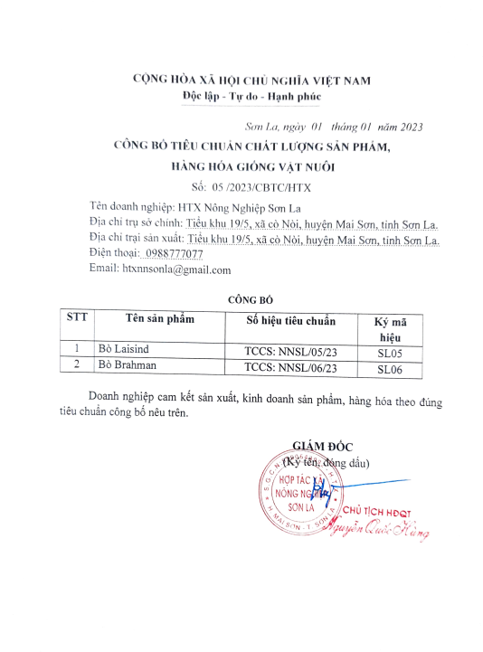 HTX Nông Nghiệp Sơn La gửi tới quý khách hàng bảng công bố chất lượng giống bò được sản xuất tại trại của HTX tại xã Cò Nòi, huyện Mai Sơn, tỉnh Sơn La.